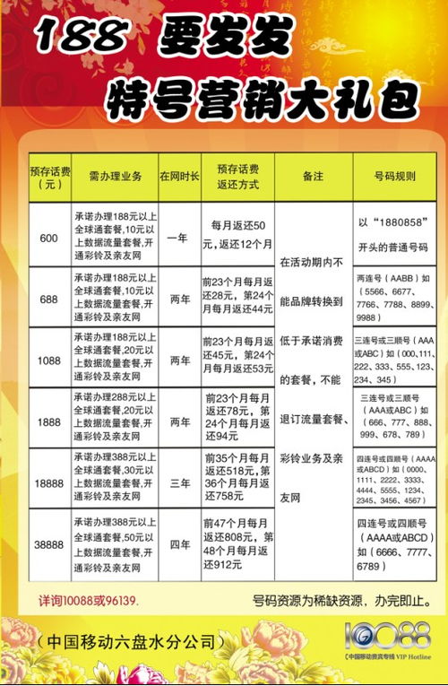 而现在188号段又成了移动大家庭中的一个新贵,不但传承着“139”高贵形象,同时为顾客提供抢占普号机会。因此,如何在这个充满挑战与机遇的时期把握好自己,是每一位用户都必须考虑的问题。加之全球经济不景气,我想买一个188“要发发”号,讨一个吉利,为新的一年带来好运。