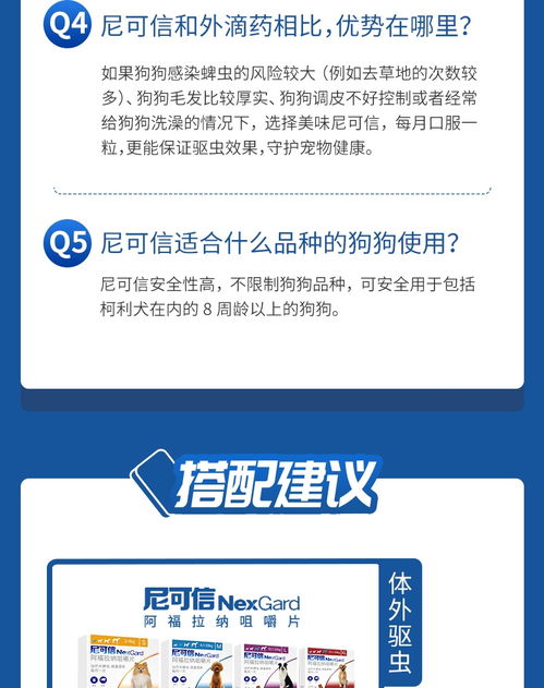 寄生虫滋生快,最短生长周期不超过2周,狗狗爱跟其他小动物玩、到处嗅,到处舔着,感染还随时间,地点,季节而变化,因此,按月按期驱虫是十分重要的,尼可信能驱逐狗的蚤,蜱和蠕形螨、耳痒螨和其他体外寄生虫,扼杀寄生虫~