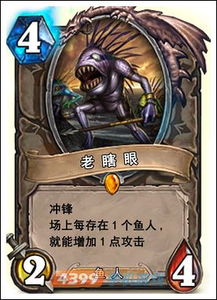 老瞎眼是游戏炉石传说中的一张传说级随从卡牌,4/2/4冲锋,在战场上每有一个其他鱼人便获得+1攻击力。需要集齐八张其他鱼人卡才能获得。